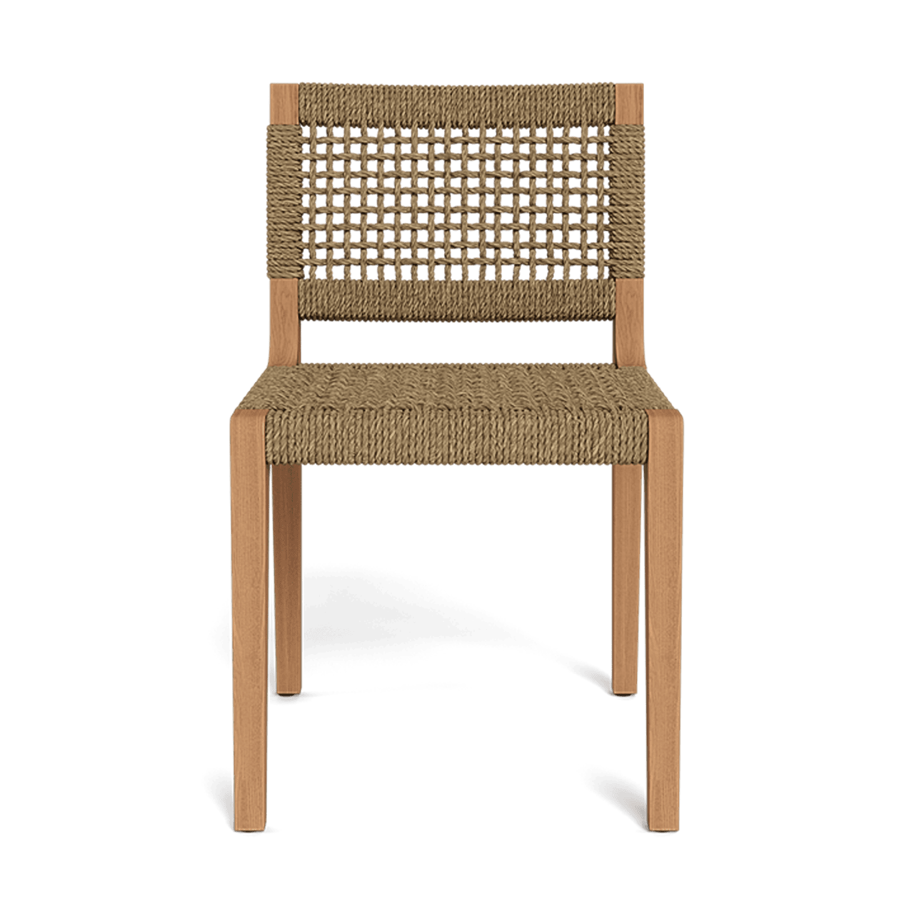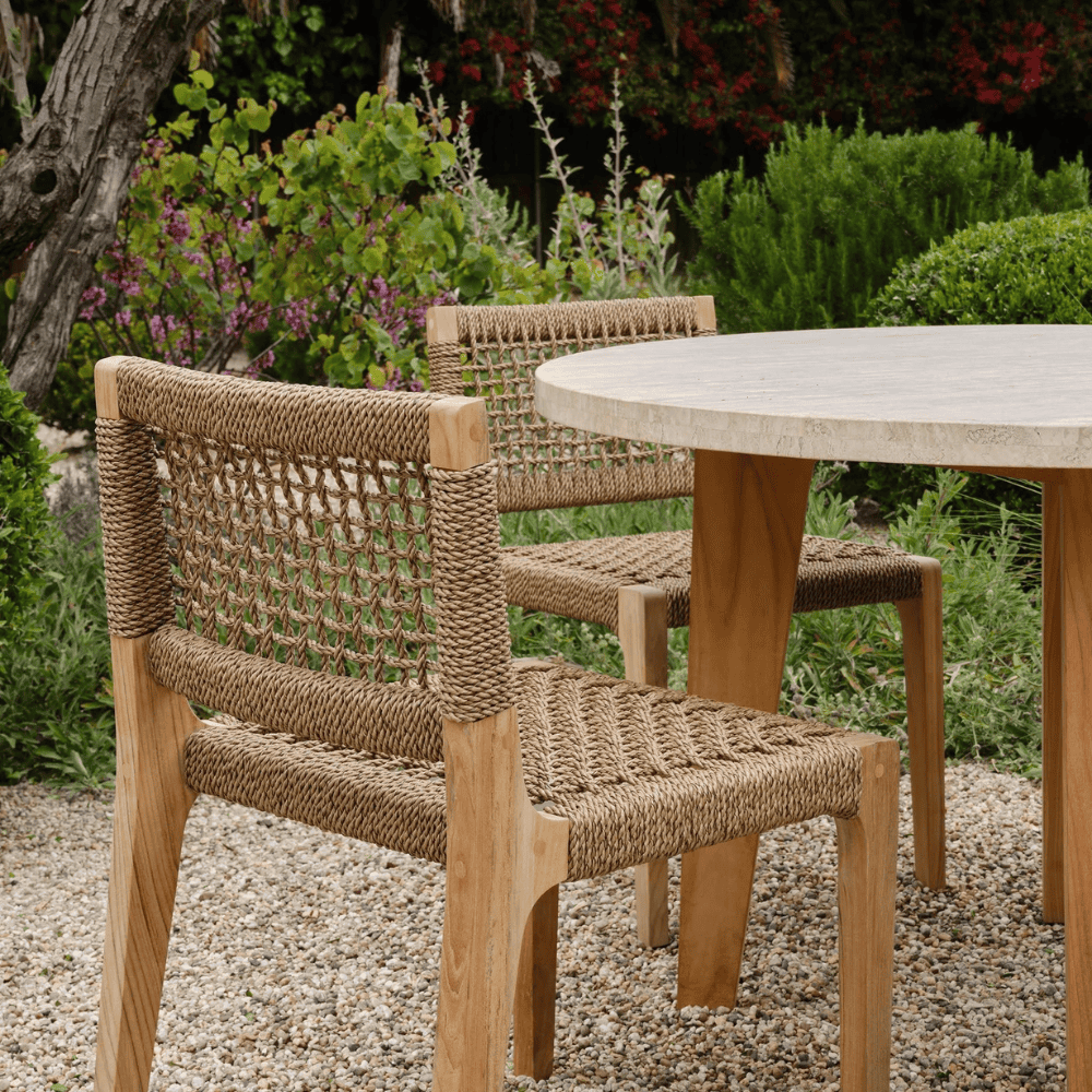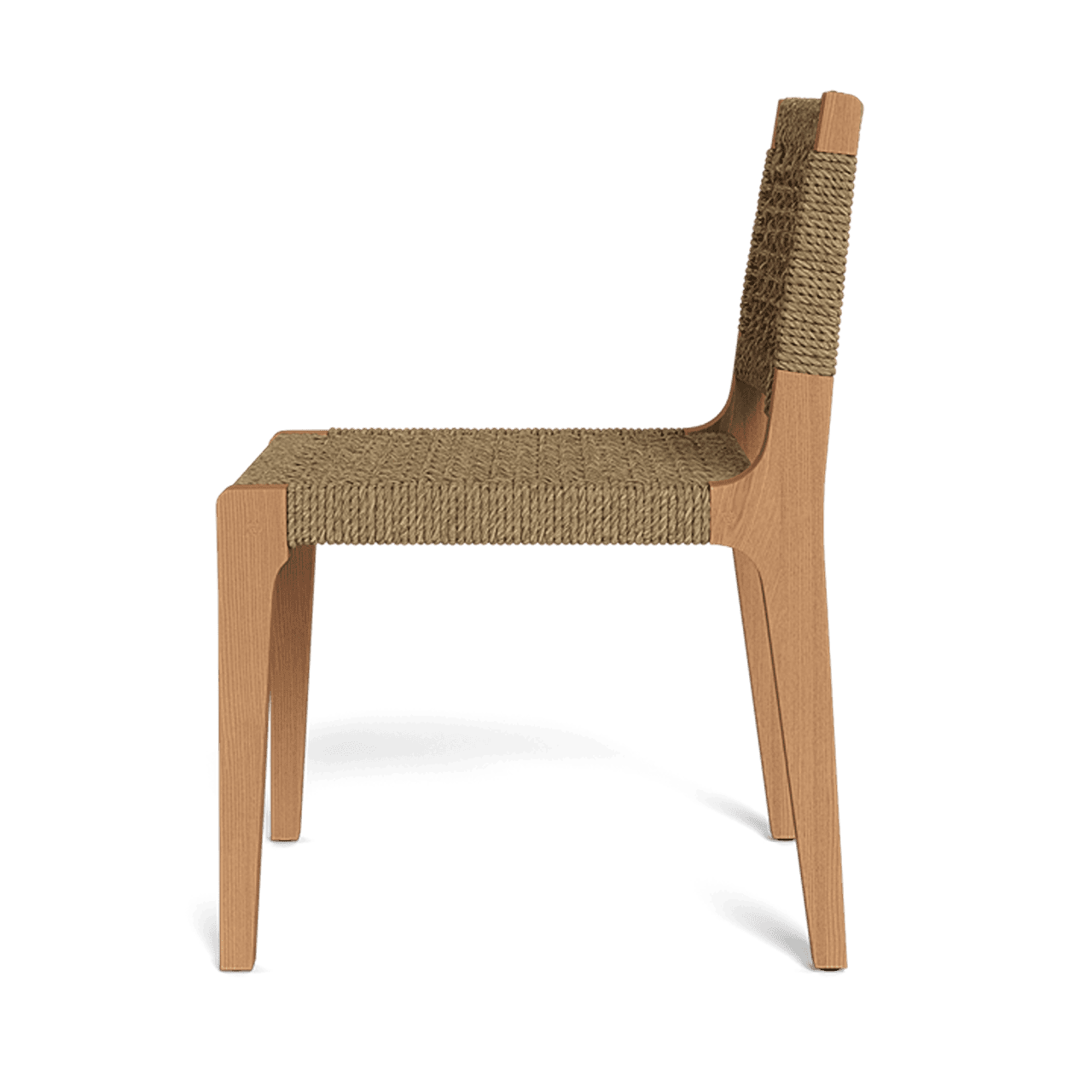 Inspired by the comfort of indoor sling chairs, the MLB Outdoor Armless Dining Chair boasts a unique design, featuring a hand-wrapped back and seat with twisted resin rope. This intricate detailing not only enhances the chair's inviting aesthetic but also elevates its comfort.