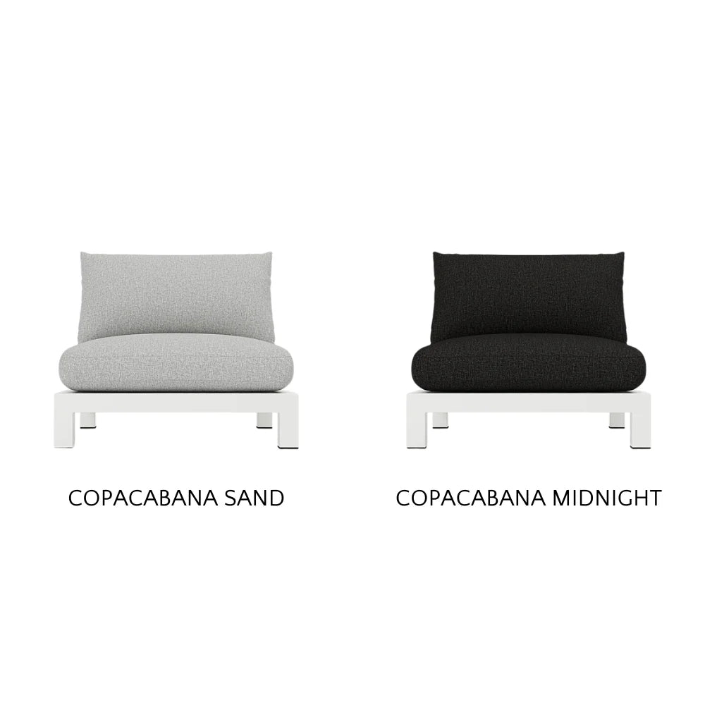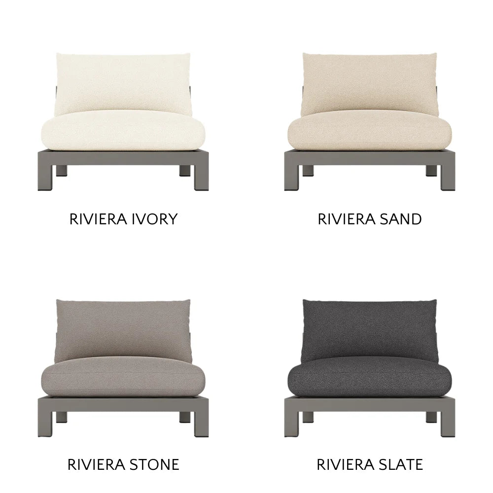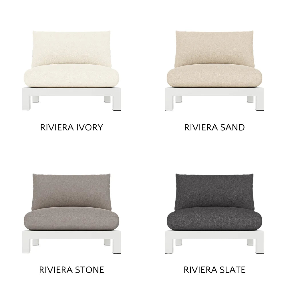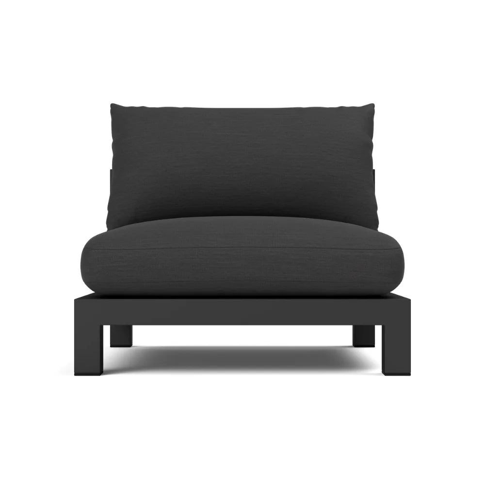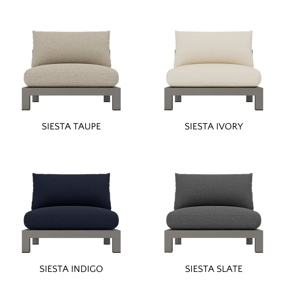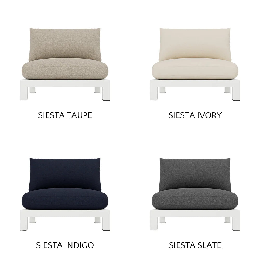 Our Pacific Aluminum collection features clean lines with a California rustic essence. Part of our sectional collection, the Pacific Aluminum Armless Single is streamlined comfort — relax on a plush domed bench cushion with a knife-edge back cushion available in a range of neutral tones and supported by a Batyline. . . Show More