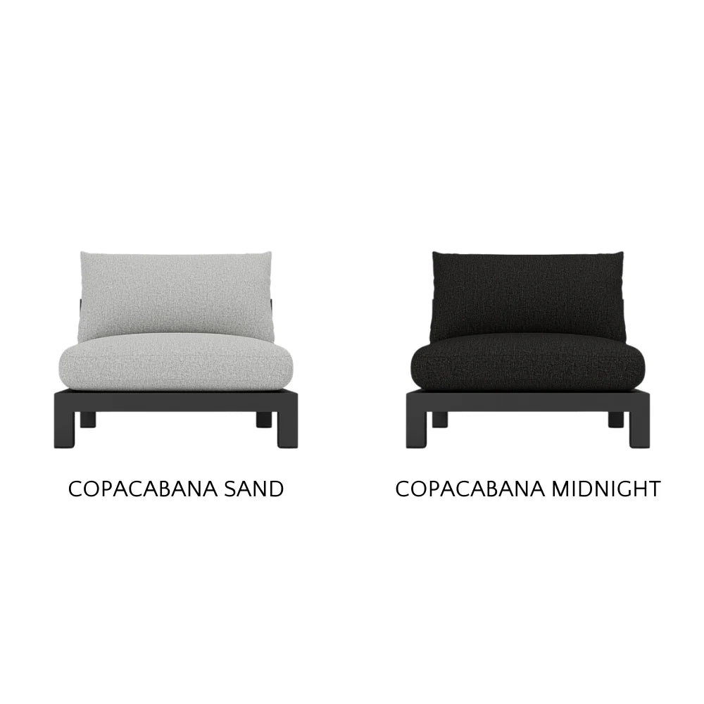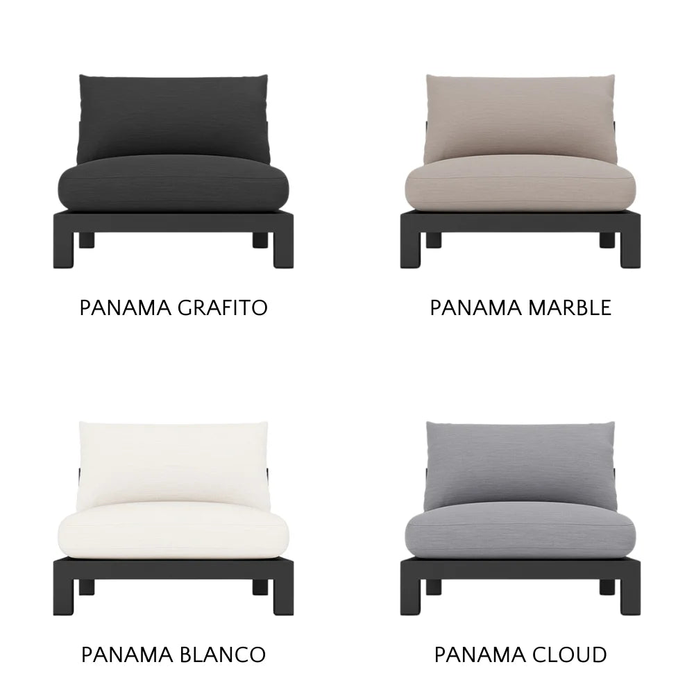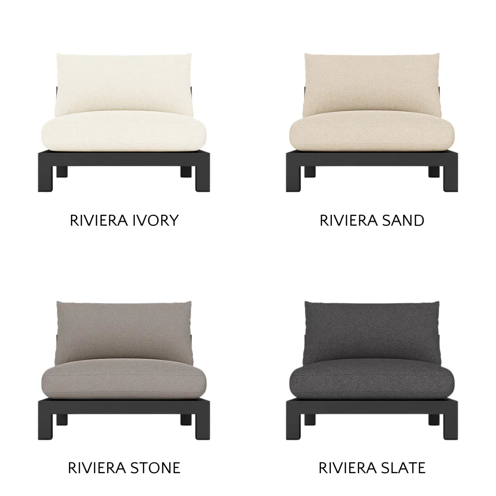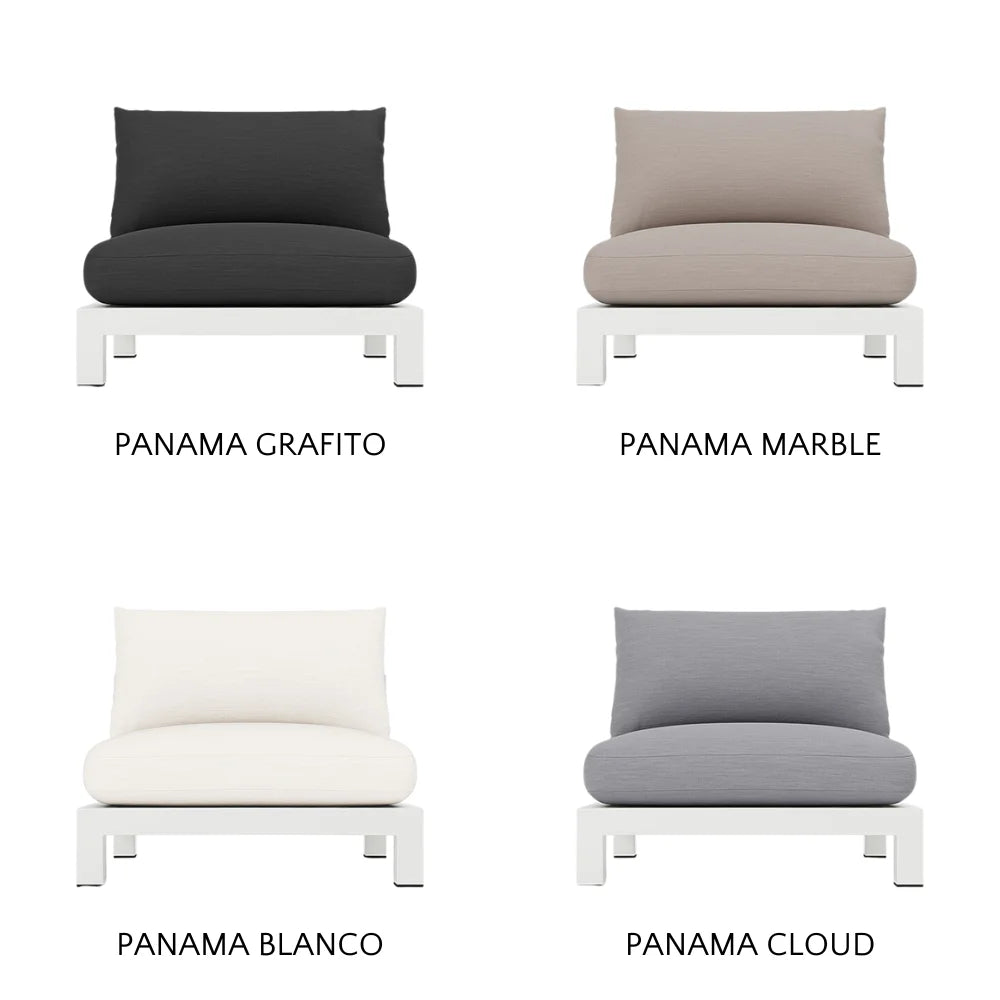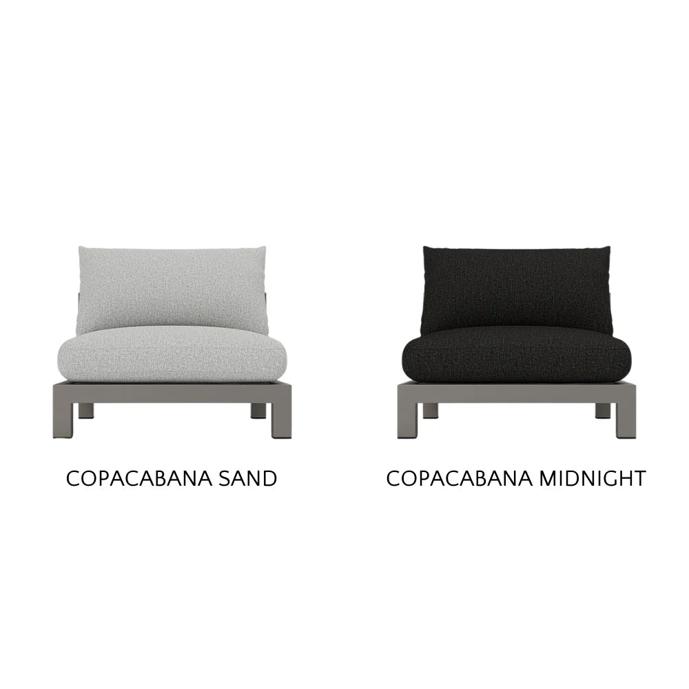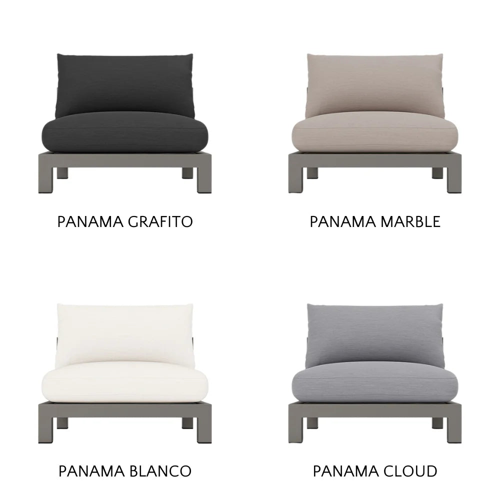 Our Pacific Aluminum collection features clean lines with a California rustic essence. Part of our sectional collection, the Pacific Aluminum Armless Single is streamlined comfort — relax on a plush domed bench cushion with a knife-edge back cushion available in a range of neutral tones and supported by a Batyline. . . Show More
