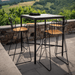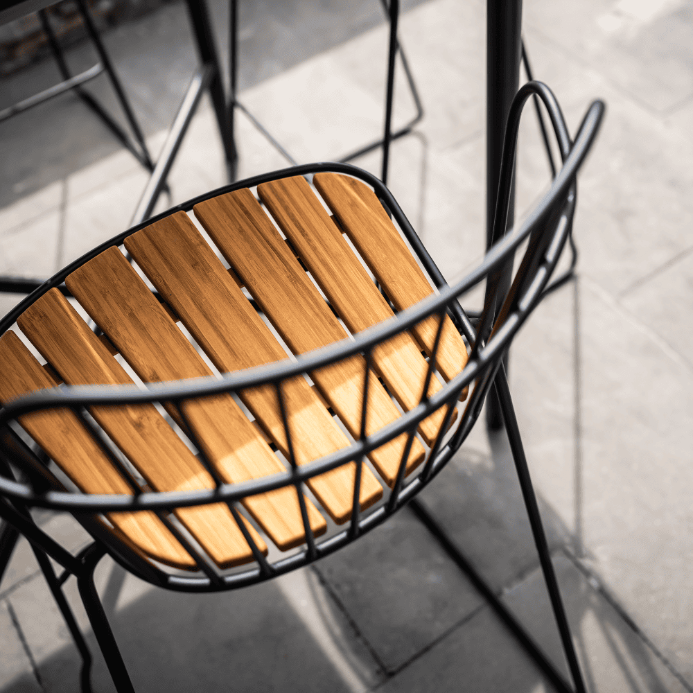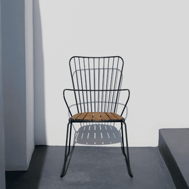 • A black metal outdoor dining armchair with bamboo lamellas seat placed against white wall Charcoal