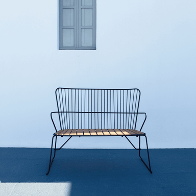 A dining chair, a lounge chair, a rocking chair, a two-seater bench, and a bar chair are all part of the PAON collection. Made of bamboo lamellas and powder-coated steel.