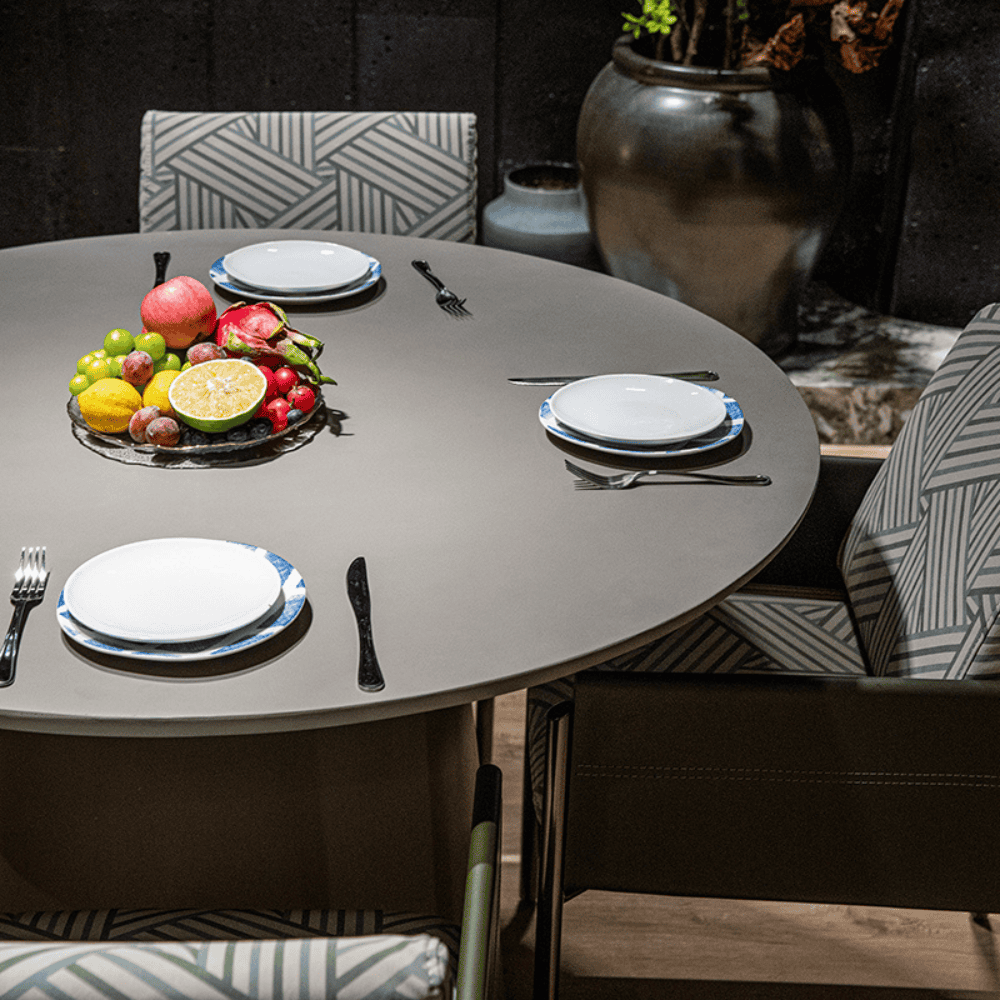Rio Outdoor GFRC Round Dining Table 48"’s solid, monolithic presence is softened by its smooth curves, making it an inviting piece of furniture that combines practicality with visual appeal. Its substantial size and weight hint at durability, ensuring that it can withstand outdoor elements while maintaining its elegant appearance over time.