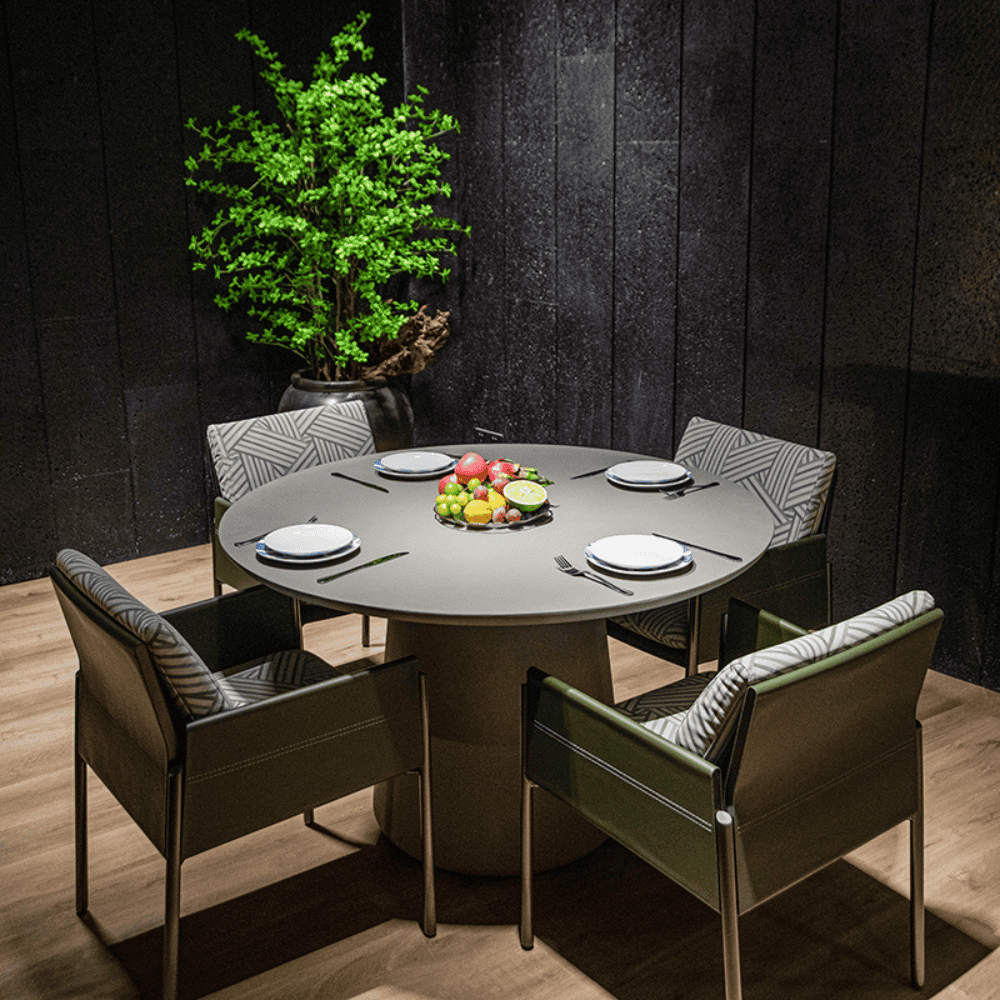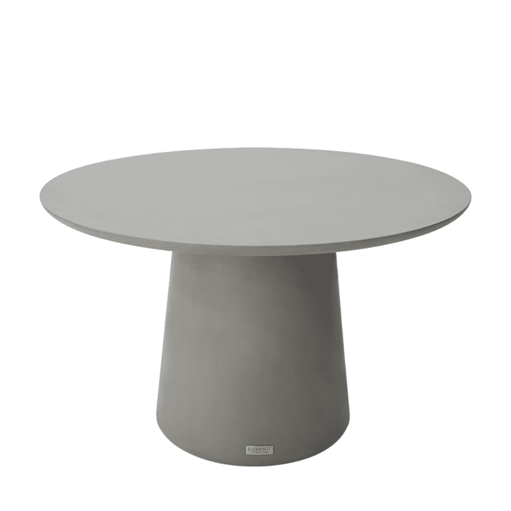Rio Outdoor GFRC Round Dining Table 48" is crafted from glass-fiber reinforced concrete (GFRC), this table boasts a sleek, round shape with a sturdy circular base, making it a stylish yet robust addition to any outdoor dining area. The table measures 48 inches in diameter and 29.5 inches in height, offering ample space for four people.