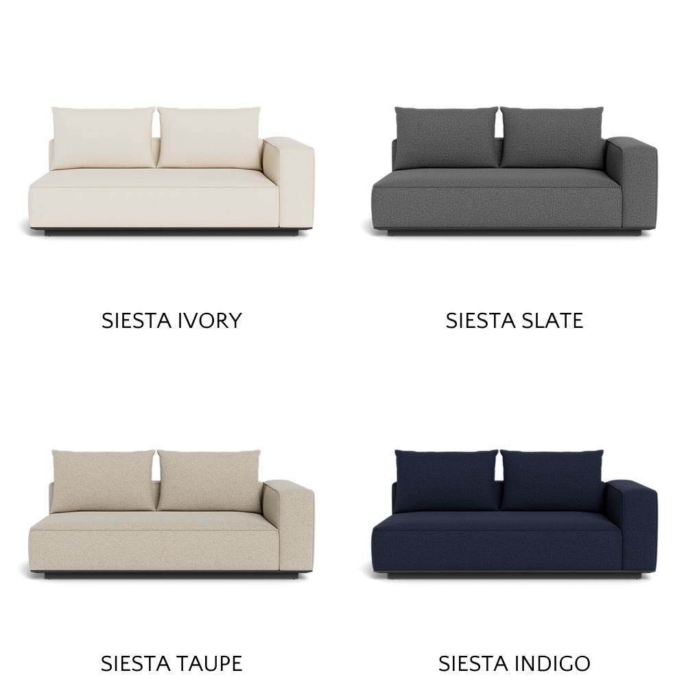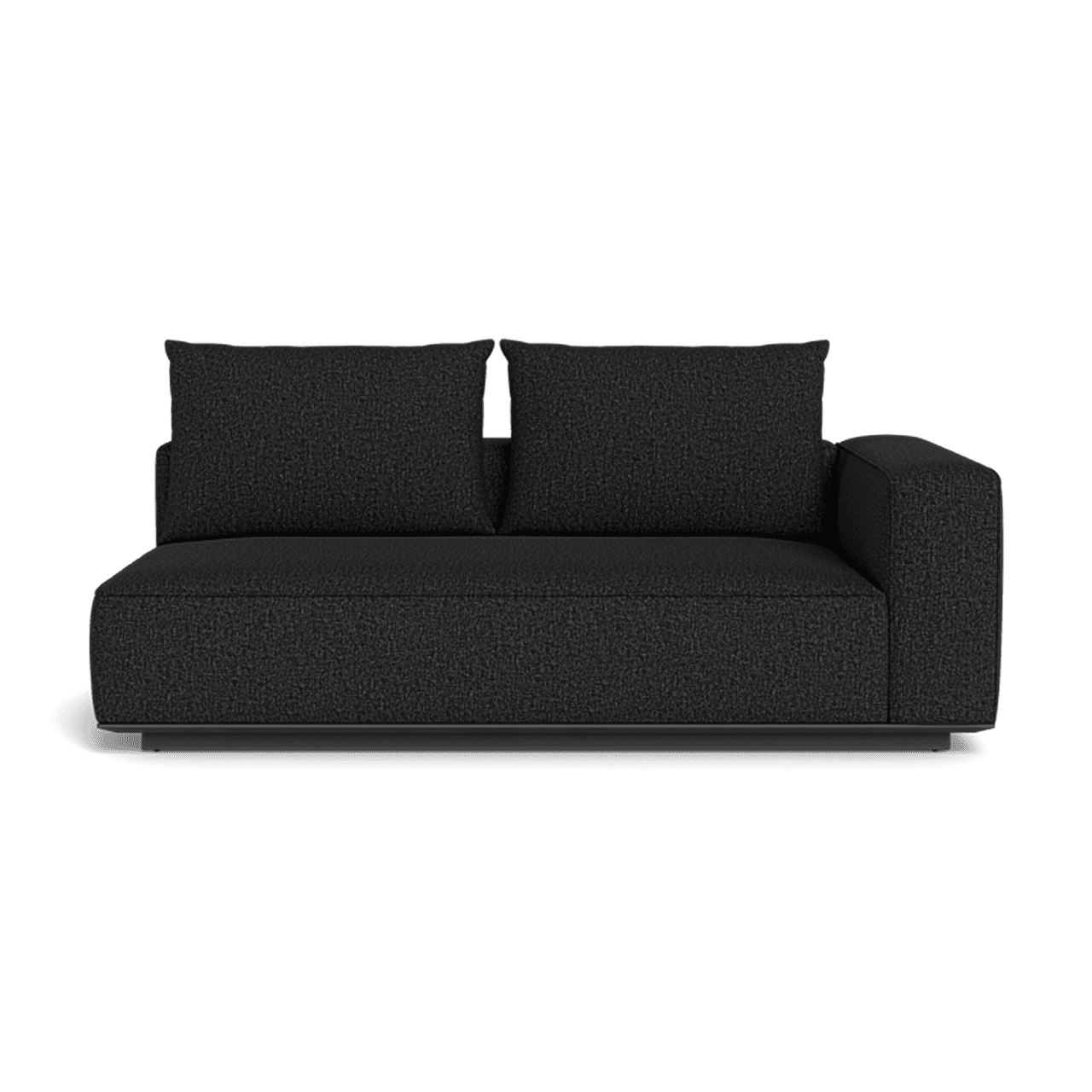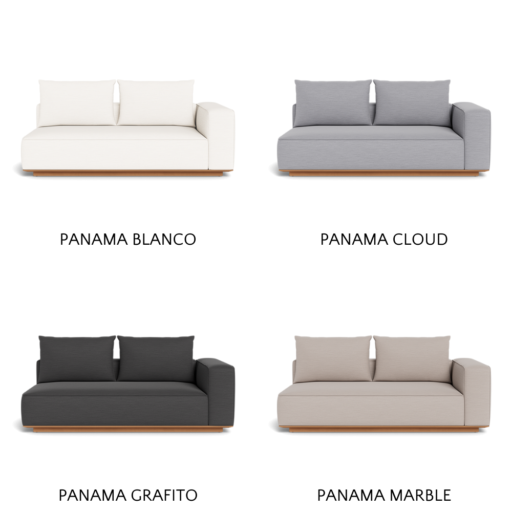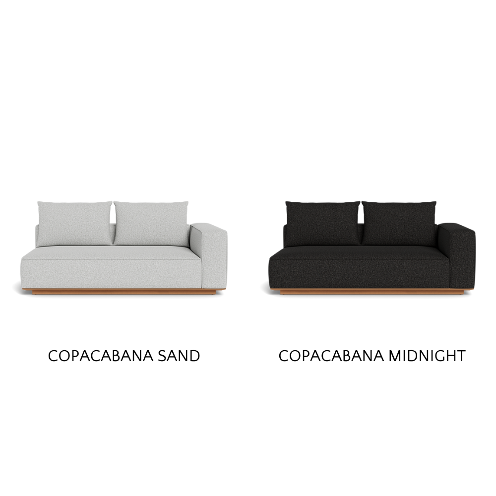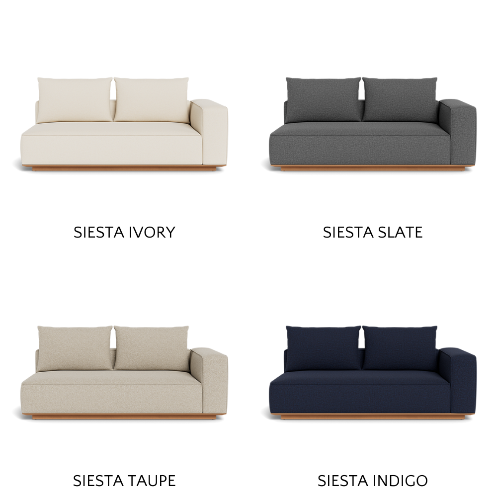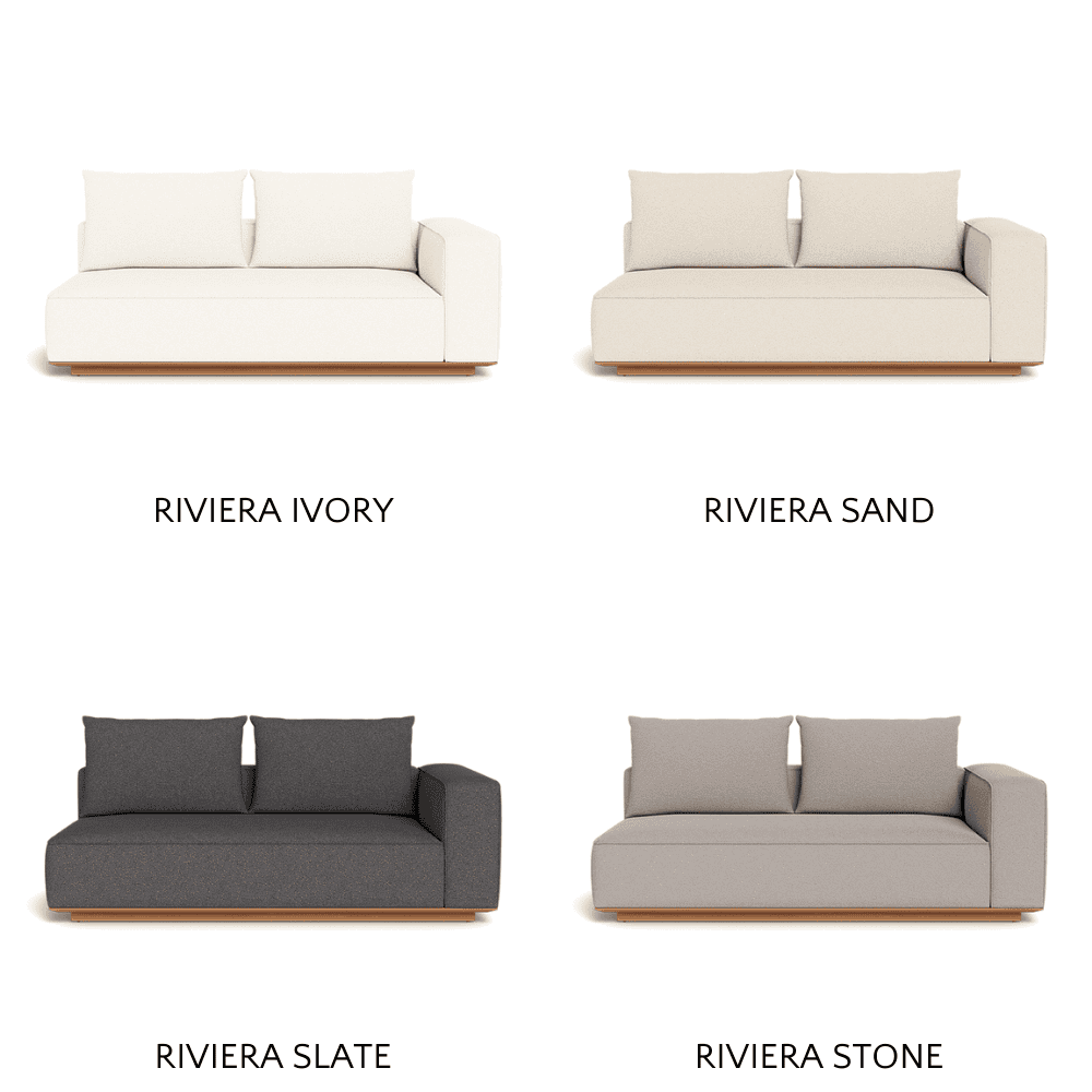 Skillfully crafted for outdoor environments, the Santorini Outdoor Right Sectional seamlessly blends comfort and versatility. Experience the luxury of sinking into its generous cushioning and appreciate the durability of its all-weather suspension system, complemented by charming accent pillows. Whether opting for an aluminum or teak plinth base, this modular sofa effortlessly adapts to any existing or future outdoor space, making it an ideal addition to your outdoor sectional patio furniture collection and complementing your array of outdoor sofas and sectionals.