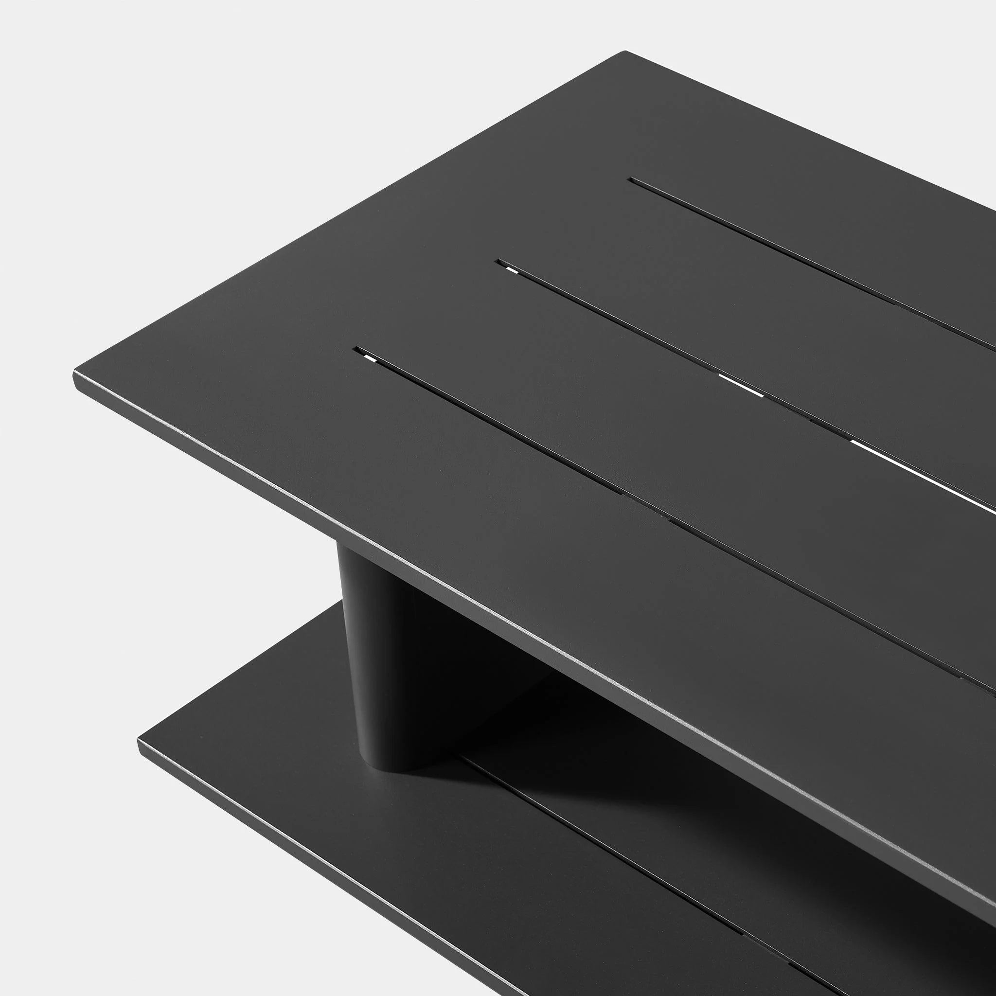 The Santorini Outdoor Slatted Rectangle Side Table enhances your outdoor setup with its versatile design. Crafted from durable extruded aluminum, this outdoor side table seamlessly blends functionality with elegance, offering a spacious surface adorned with a sleek slatted pattern. Whether expanding surface area alongside modular sectionals or serving as a convenient corner piece for hosting, it effortlessly elevates your outdoor entertaining experience. As an essential addition to your outdoor small tables collection, it combines practicality with aesthetic appeal, ideal for patio gatherings or as a complement to your decor. Available in aluminum, ceramic, and various colors and styles, it ensures a seamless integration into any outdoor space, promising enduring functionality and timeless style.
