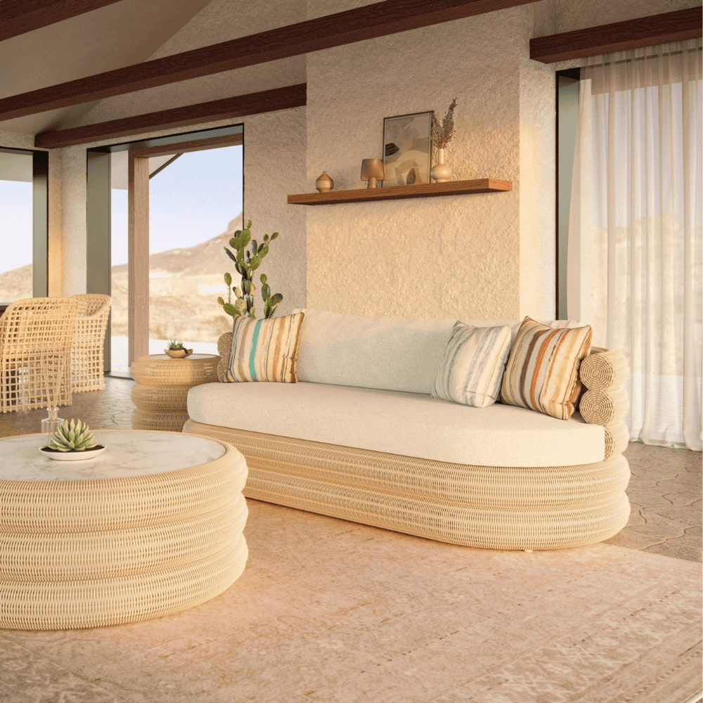Indulge in opulence and relaxation with the Texoma 3 Seat Outdoor Sofa by Boxhill. This premium sofa is expertly constructed using all-weather wicker in a sophisticated almond hue, ensuring its resilience against any weather conditions. The meticulous attention to detail is evident in the intricate textures and clean lines, resulting in. . . Show More