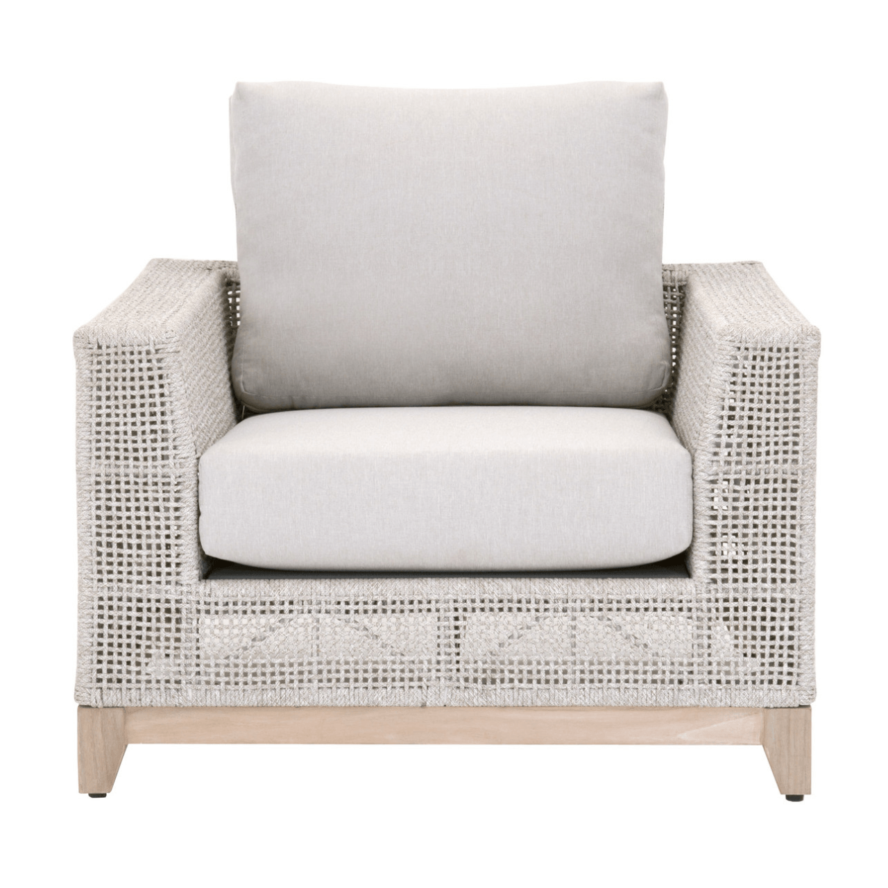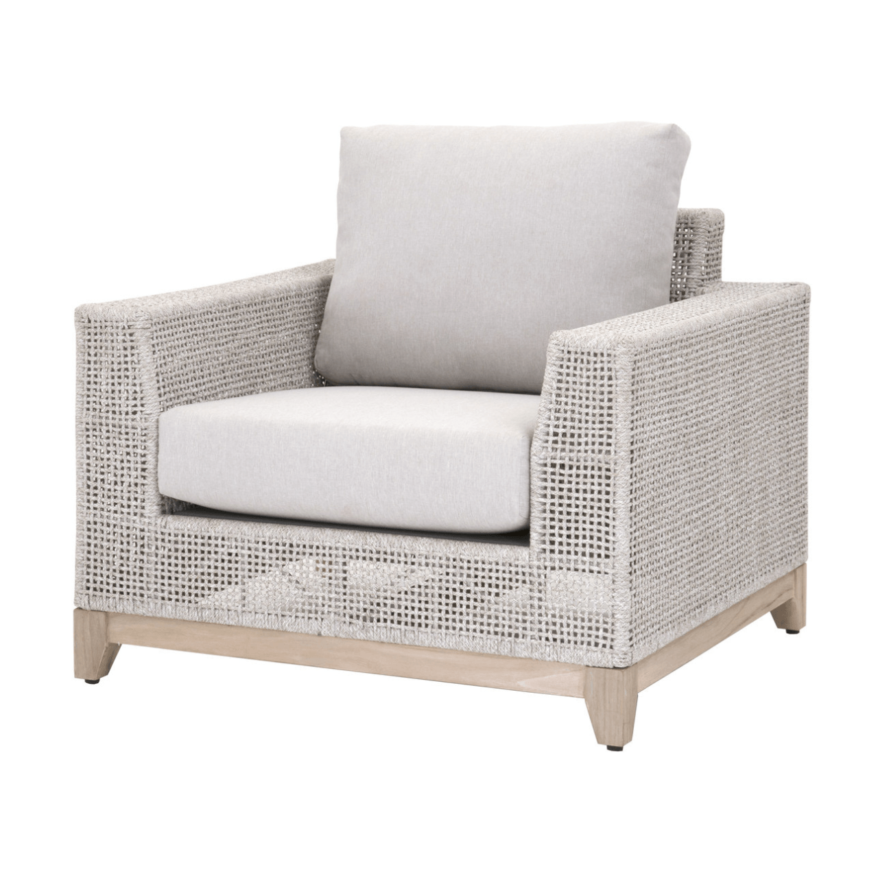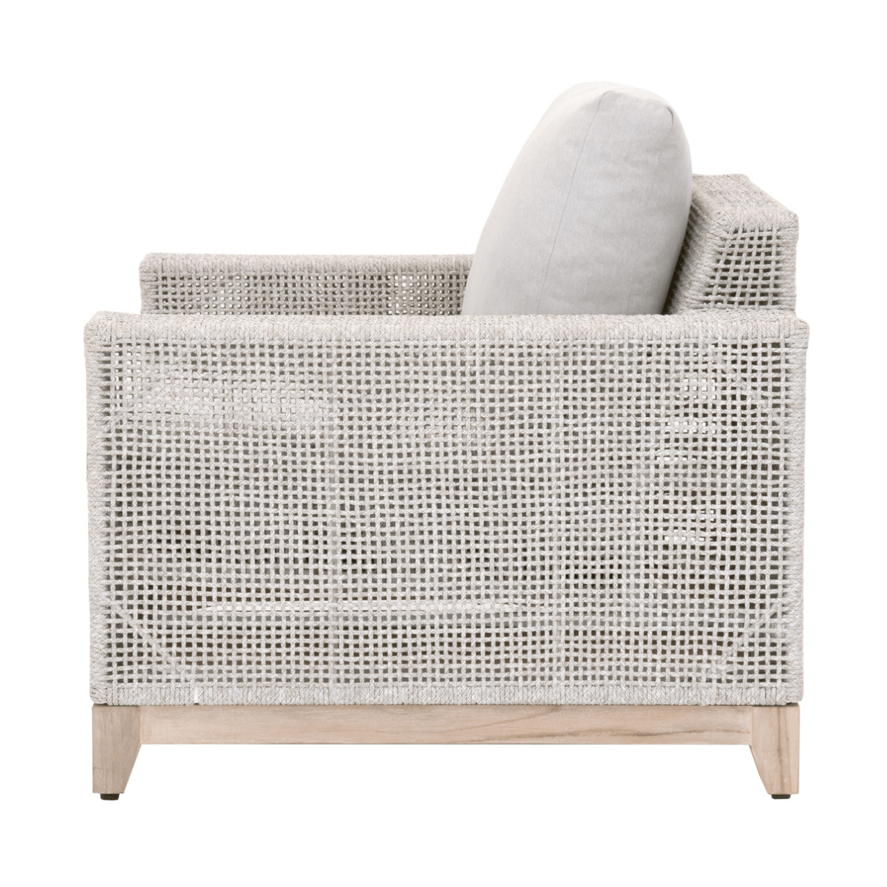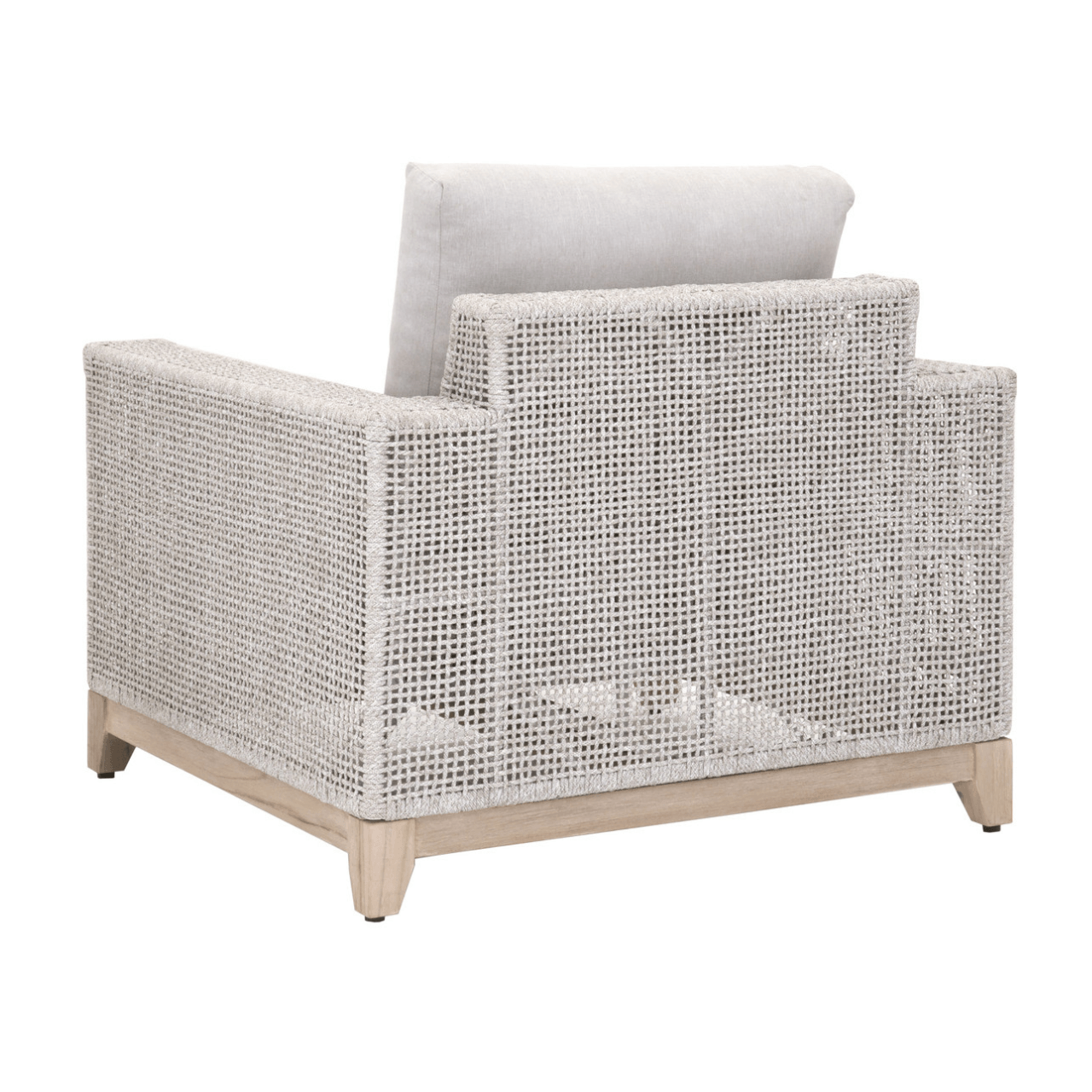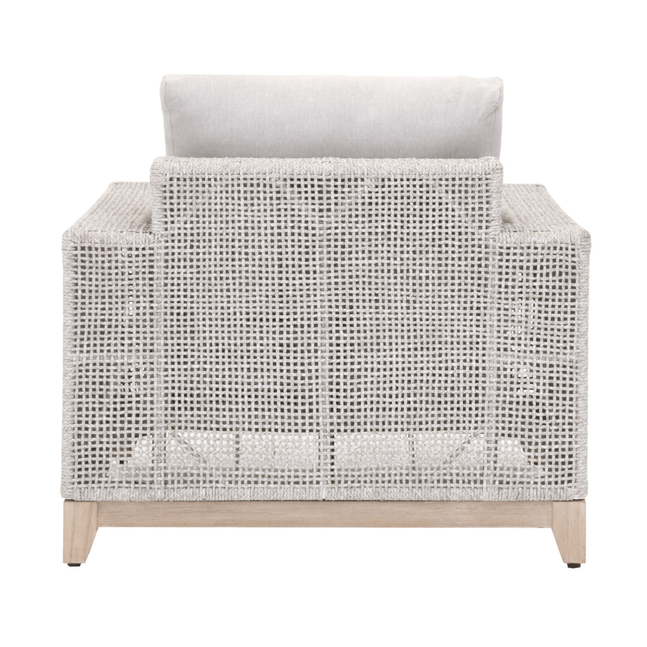 BOXHILL's Woven Tropez Outdoor Sofa Chair features a lovely and intricate rope weave design with a solid teak wood base and legs. This outdoor chair is made with natural material making it suitable for indoor and outdoor use. Paired with a removable all-weather seat cushion, the chairs provide comfort with style and will be the perfect addition to any decor!